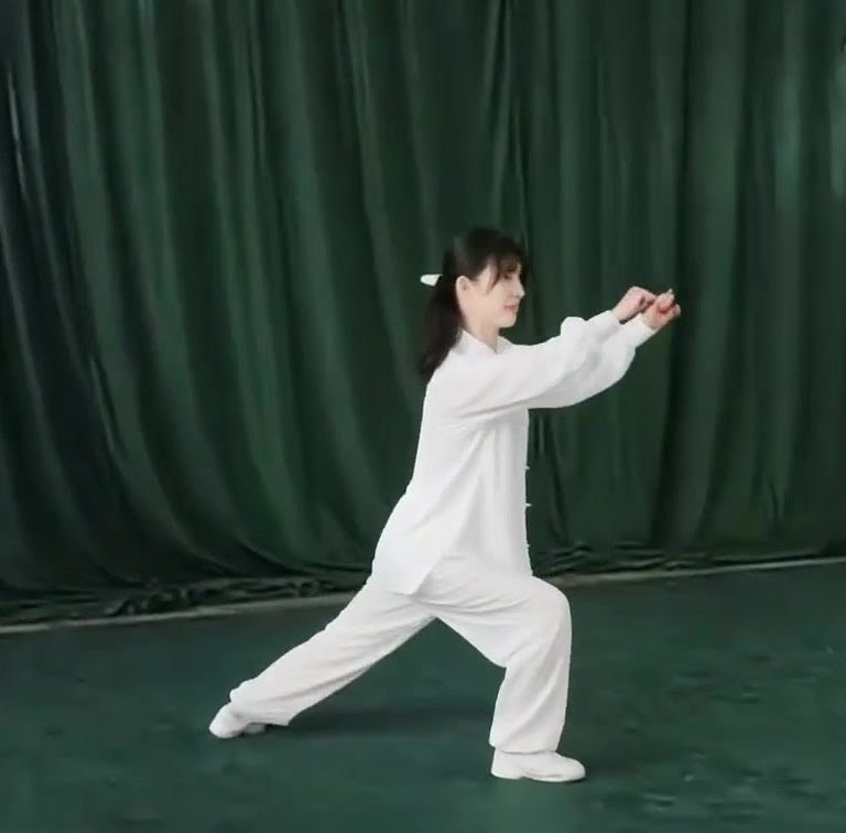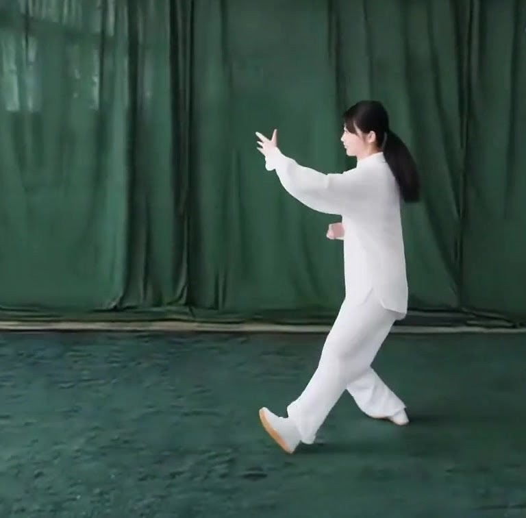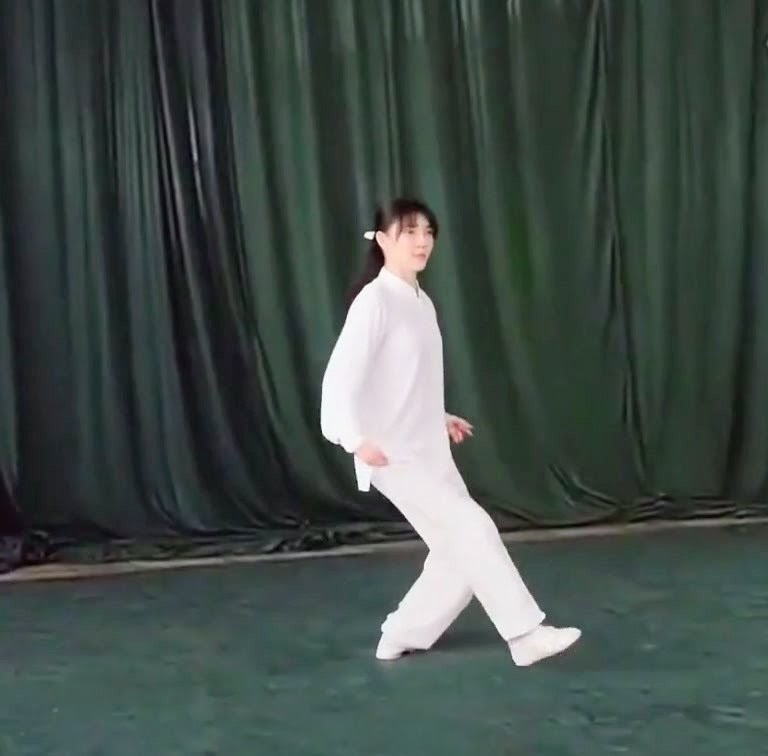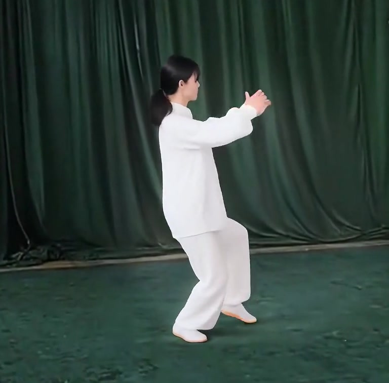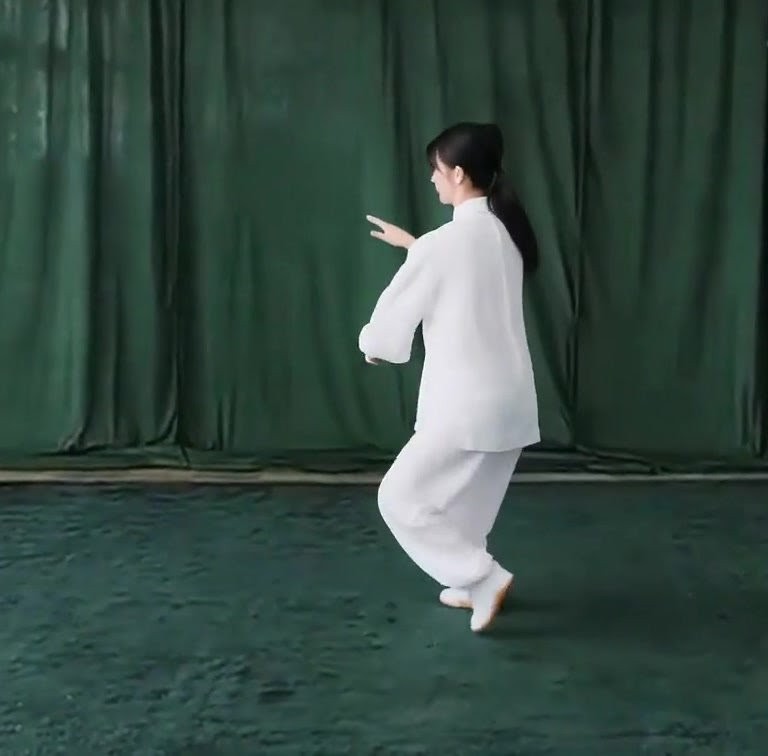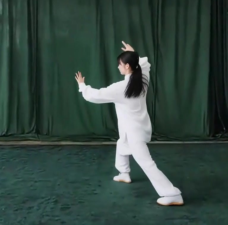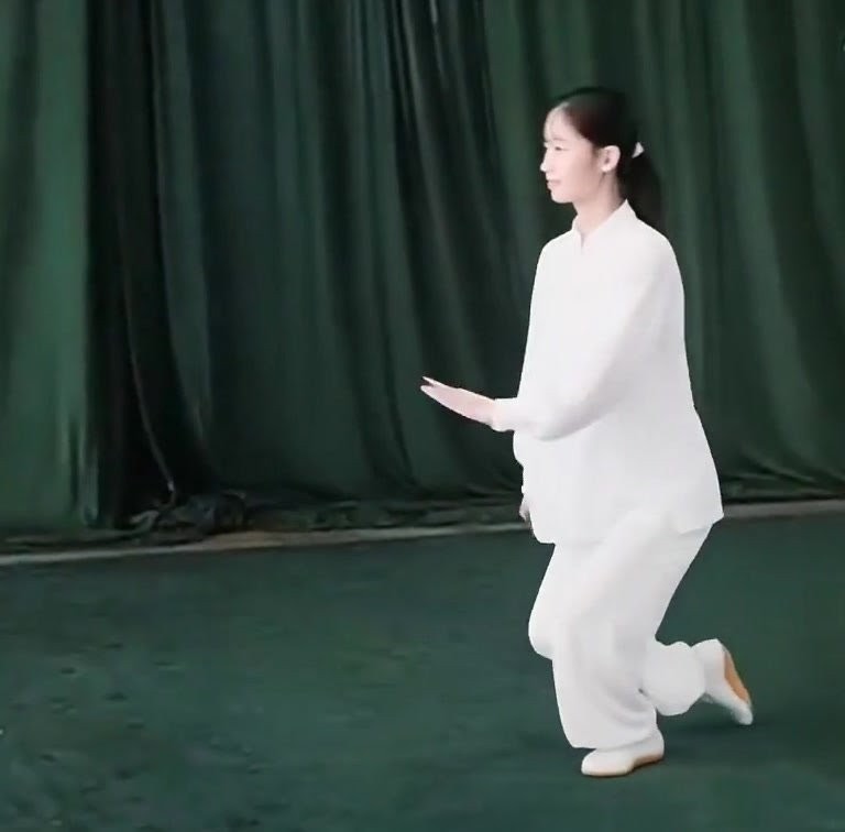 左足だけで立ち、左ひざをまげて足底を地につけつつ、上体を前におしだす。つまり重心が前に移ったのにつれて、足底を全部地にもにつける。そして重心を左脚にうつす。このとき右足は足底の前丘部を軸にして爪先が前にむくよう方向を補正し、ひざをややまげて「右虚歩」をつくる。左手は耳のそばからさらに前に押し出し、手のひらは前にむけて立てる。また左手は手のひらを上にむけたまま、手が左胸の外側にくるまで、ひじをひく。