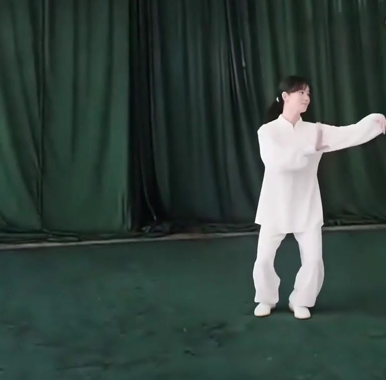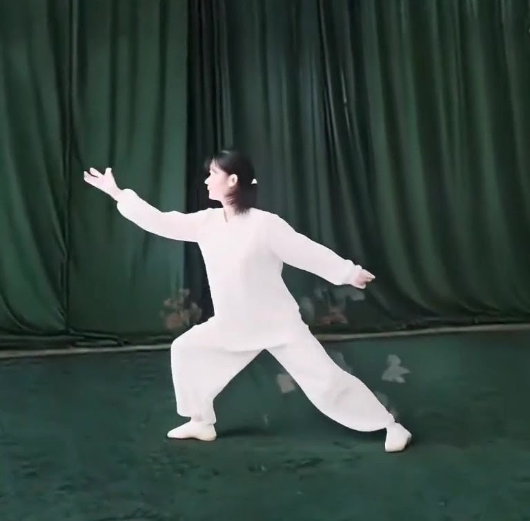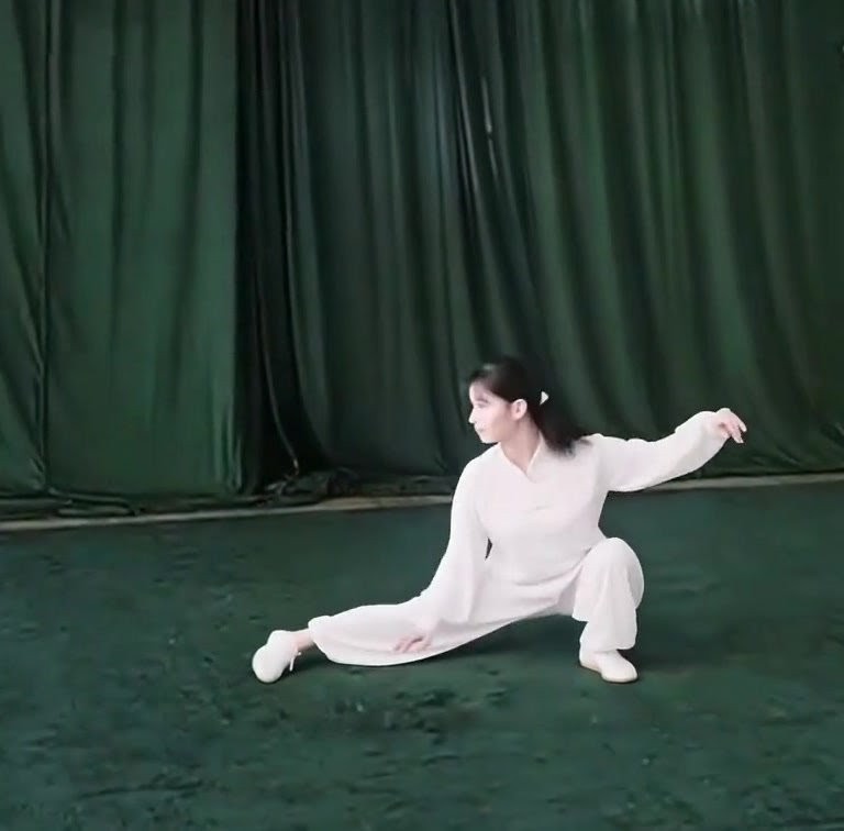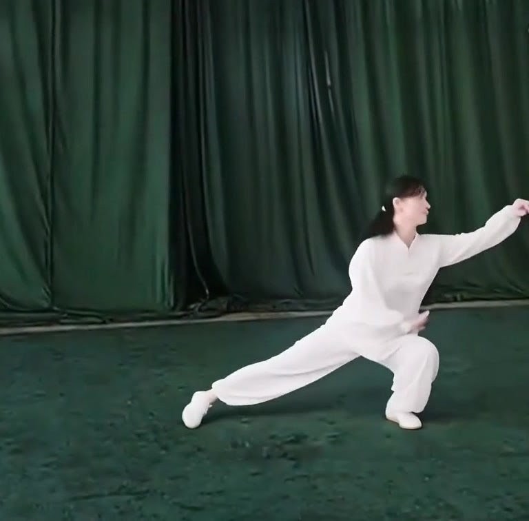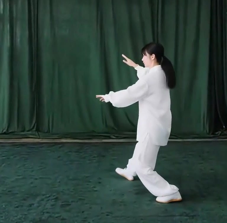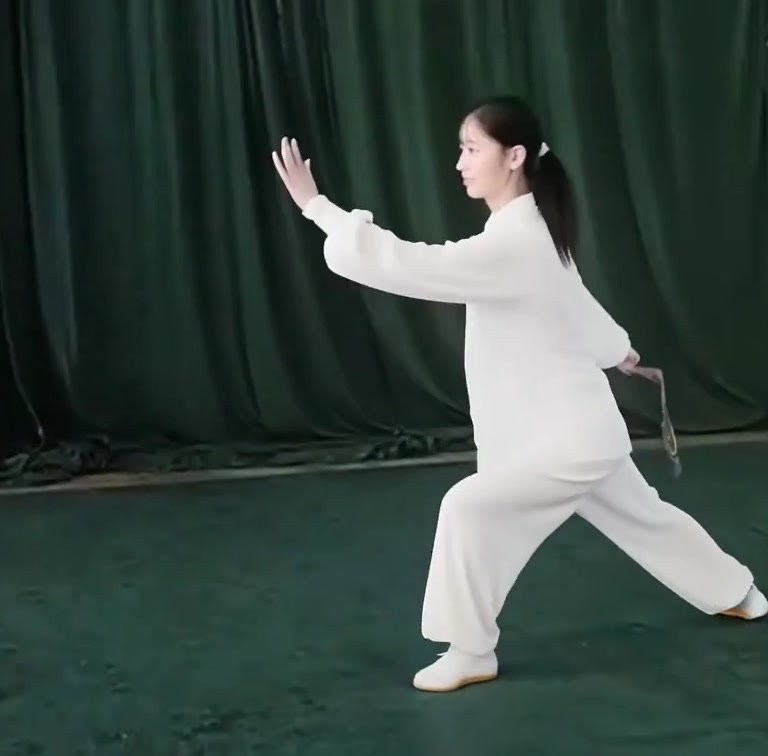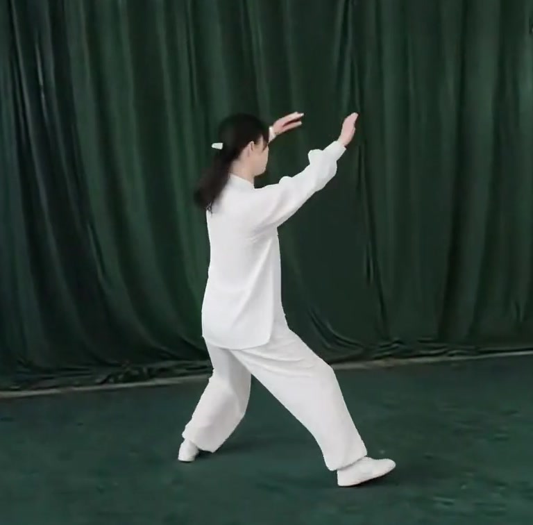 左足だけで立ち、左ひざをまげて足底を地につけつつ、上体を前におしだす。つまり重心が前に移ったのにつれて、足底を全部地にもにつける。そして重心を左脚にうつす。このとき右足は足底の前丘部を軸にして爪先が前にむくよう方向を補正し、ひざをややまげて「右虚歩」をつくる。左手は耳のそばからさらに前に押し出し、手のひらは前にむけて立てる。また左手は手のひらを上にむけたまま、手が左胸の外側にくるまで、ひじをひく。