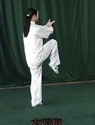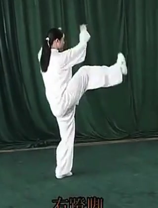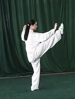 右足先だけで立ち、右足を右前方(正面より約30度右)にむけて蹴りあげる。このとき足先を立てて、かかとに力を入れる。同時に両手をそれぞれ右前と左後に弧を描いて分け開き、手のひらを外むきにして、左右に押すように挙げる。腕は伸ばすが肘はかすかに屈げ、また左手と右脚は上下の位置で相対する。また左脚はやや屈げる。