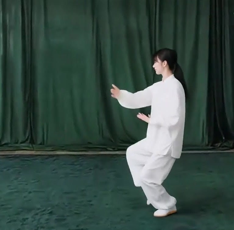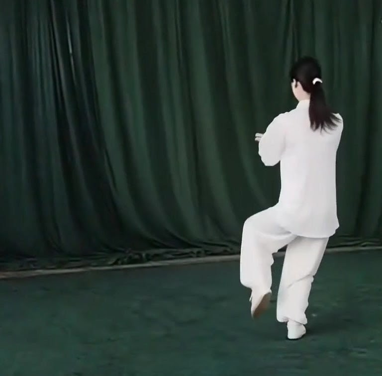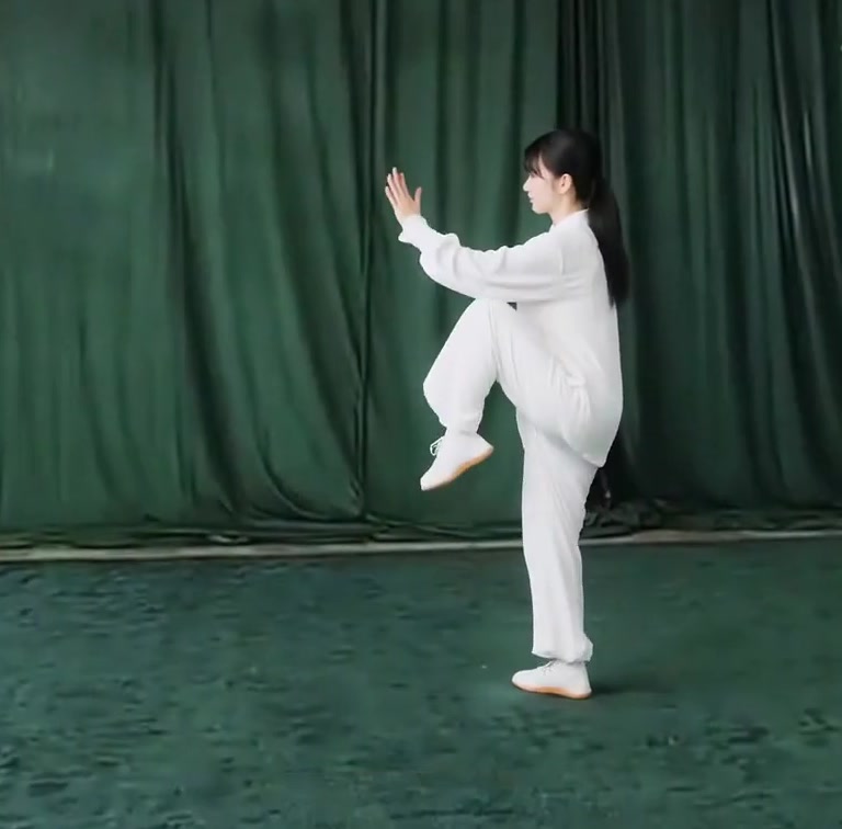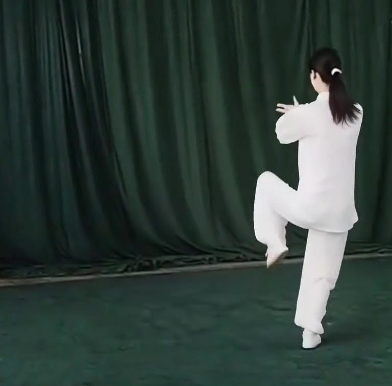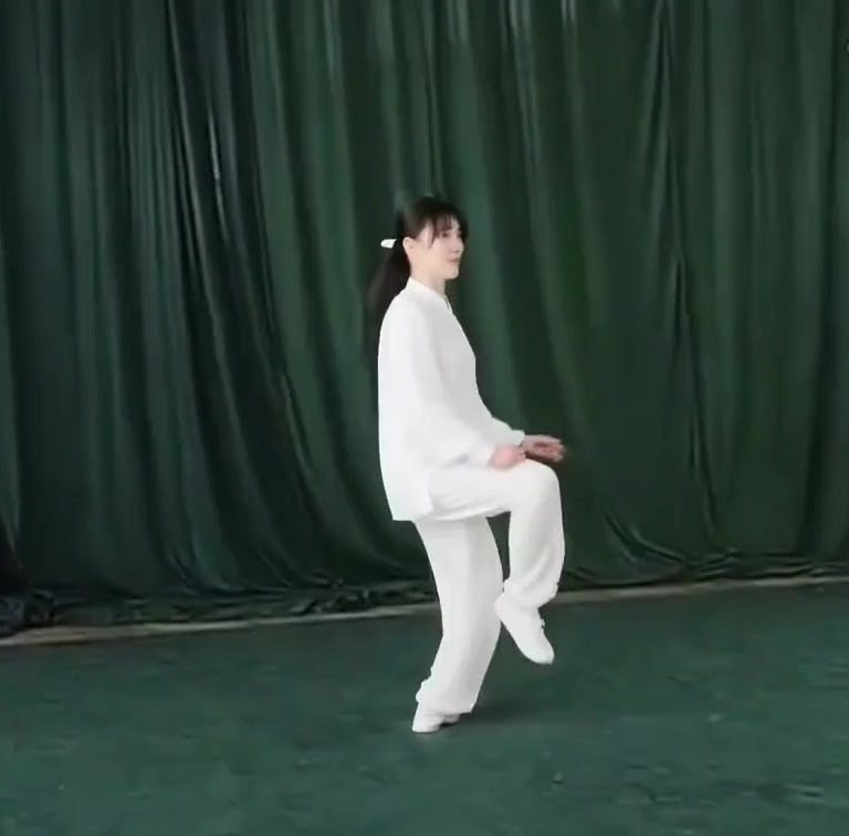 ①右脚(ひざをまげたまま)に完全に重心をうつす。(以内与前こごみになる。)②左足を地から離し徐々にひざをまげつつ前にあげ、足先は自然にたらし、右脚だけで立つ。上体はまっすぐにする。②左手をおろして手のひらを開きながら左脚の外側にそって前へ出し、ひじをまげ、上体、手のひら(右むき)を直立させる。左ひじと左ひざが相対する。②右手は徐々におろし、手のひらで下をおすようにして右もものそばにおく。(指先は上げぎみ)