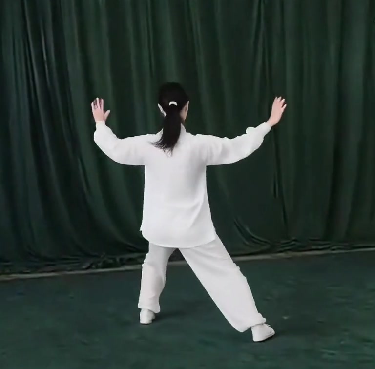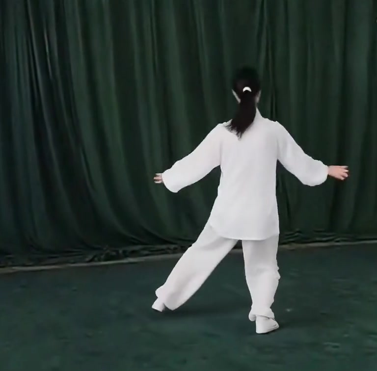 左足の膝を屈げながら体を後にひいて重心を左脚に移し、上体を左にまわす。同時に右脚はひざをのばし、かかとを軸にして、つま先をあげ左にまわす。同時にまた、両手は拳を徐々にひらき、上から左右に向かって弧を描いて平行に分け開く。(手のひらは前向き)