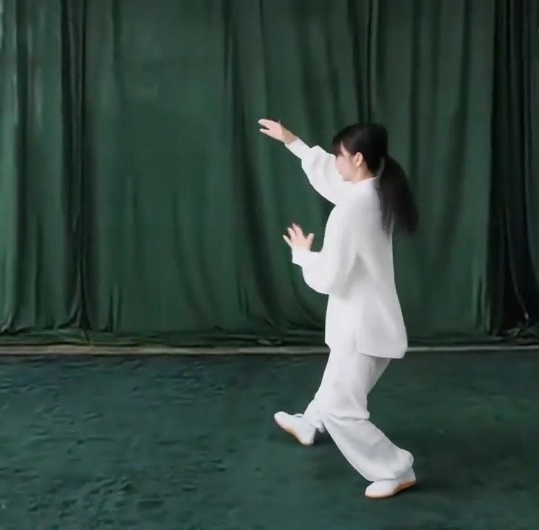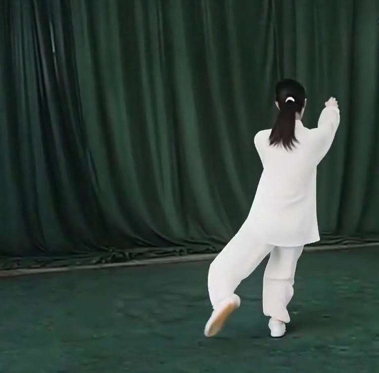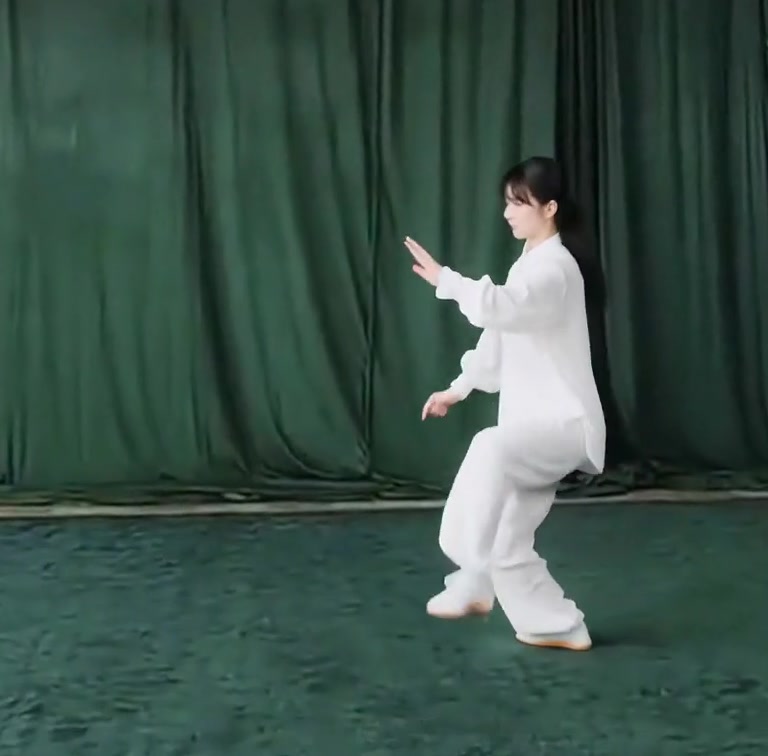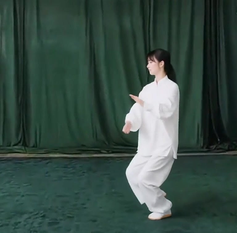 体の重心を安定させ、右膝をもちあげる。右足先は自然にたらす。左手は左後に、右手は右前に分けはじめる。