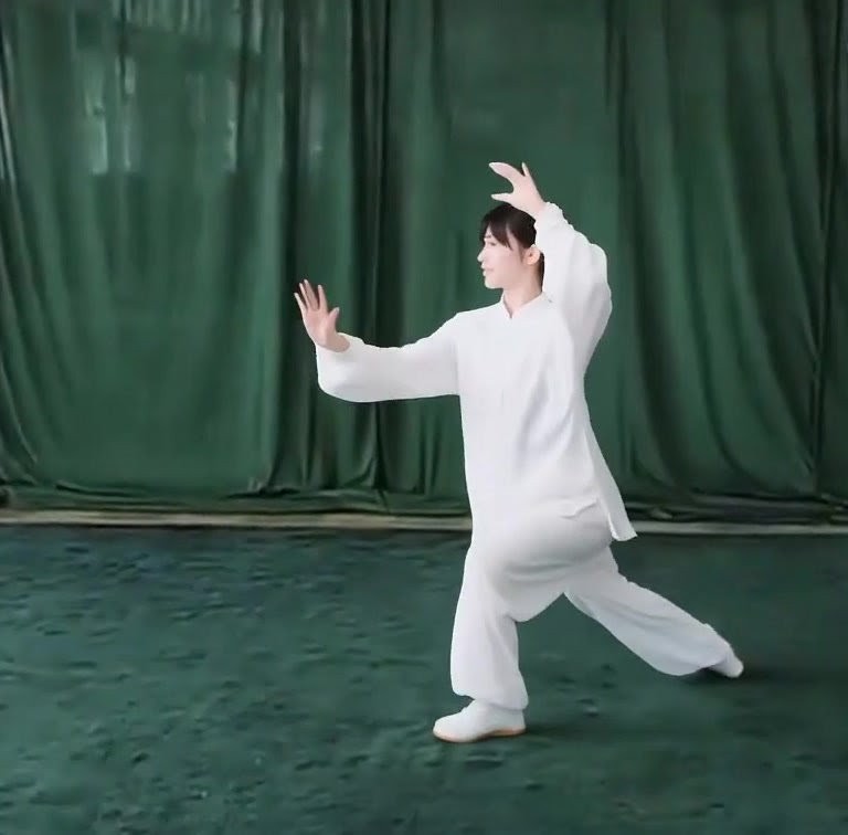 体の重心を安定させ、左膝をもちあげる。左足先は自然にたらす。右手は右後に、左手は左前に分けはじめる。