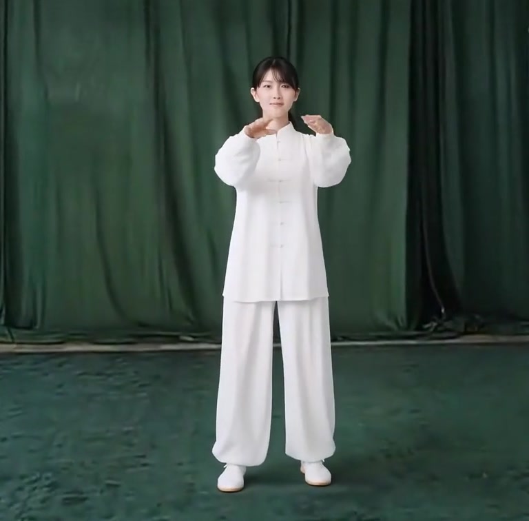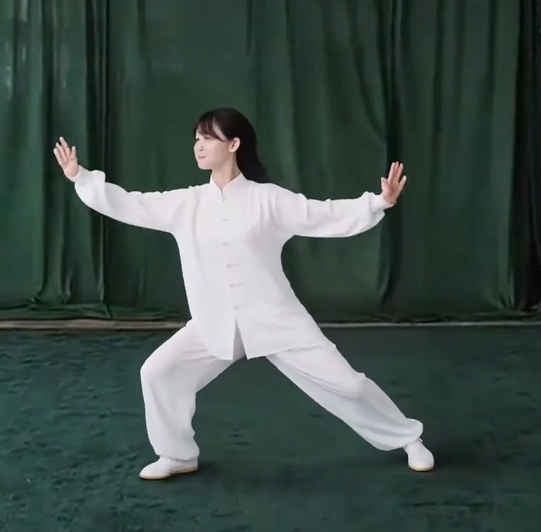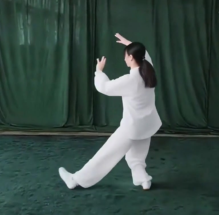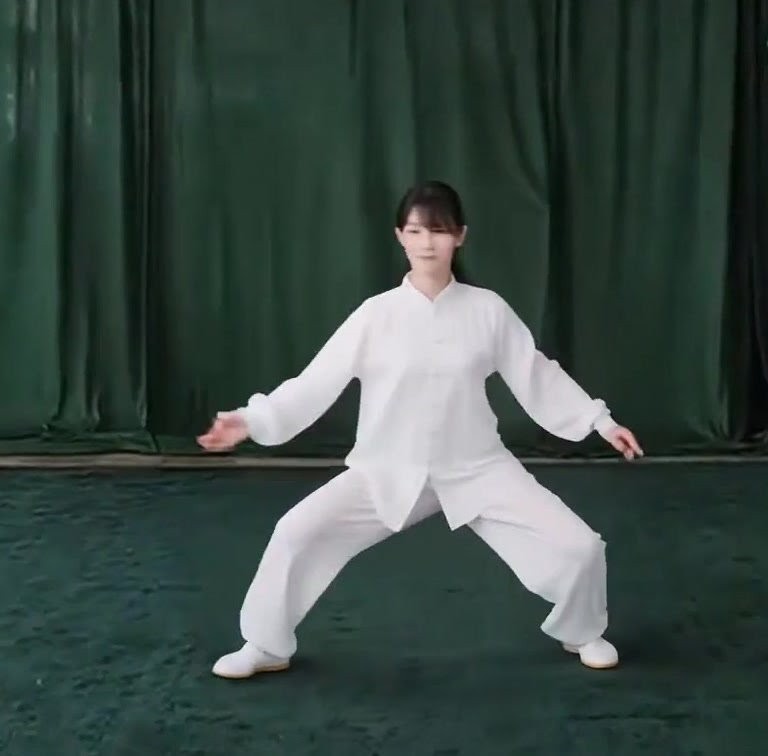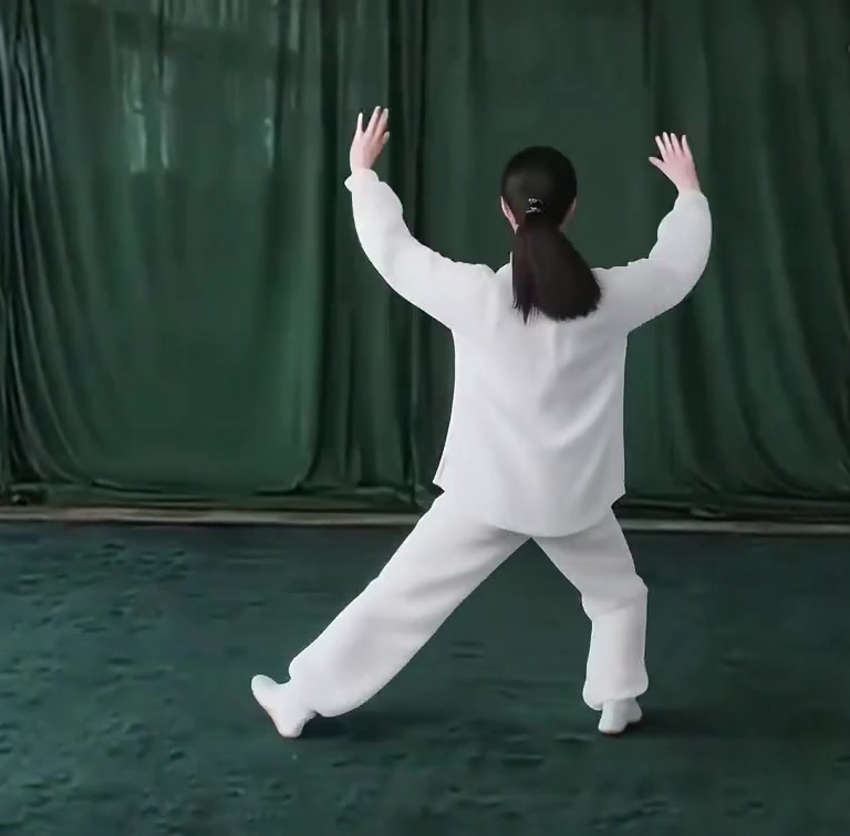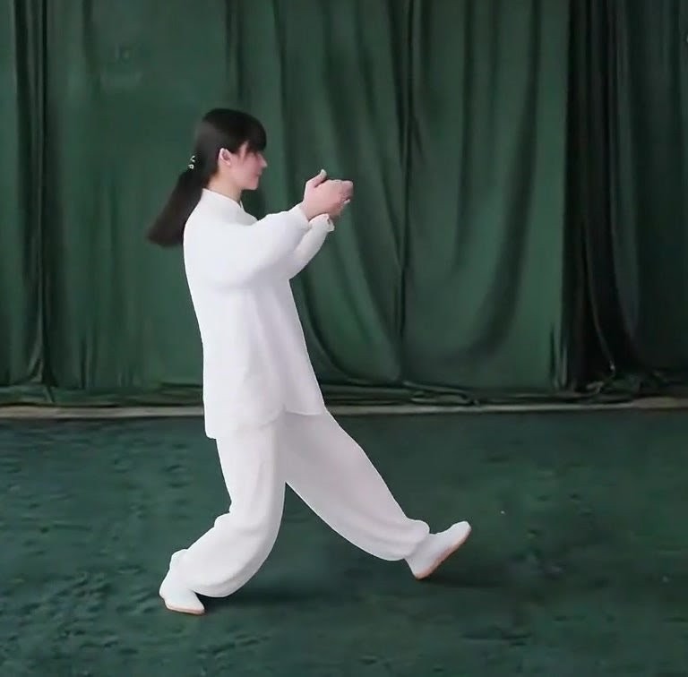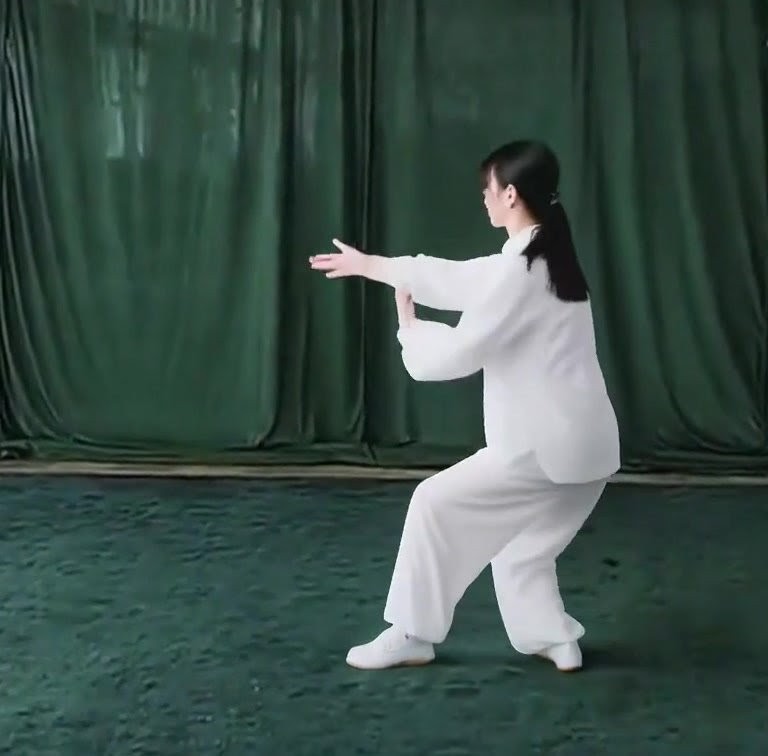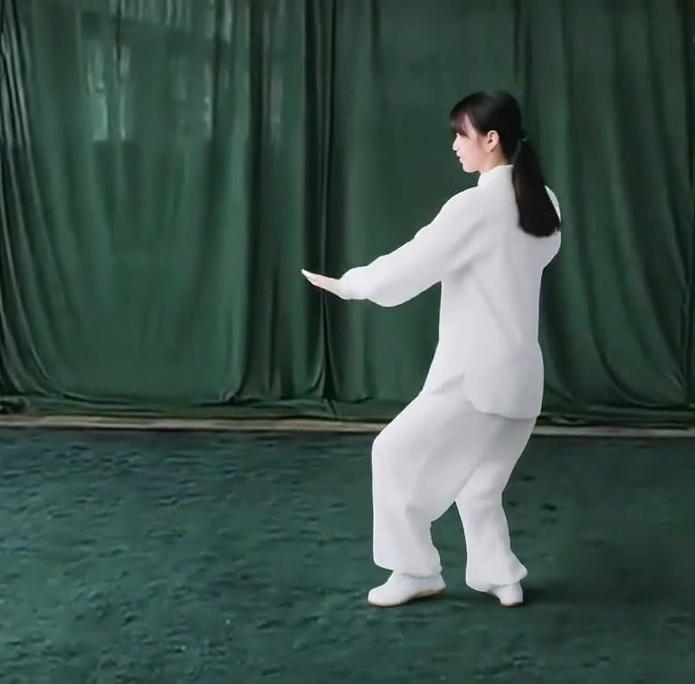 上体を後にひいて、重心を右脚に移しつつ右ひざをまげ、左脚はのばして爪先を上げる。ひじをまげて両手をゆっくり手前にひきよせ、胸の前で手のひらをひるがえして下向きにし、それぞれ肘(あばら)のそばにもってくる。(上体をまっすぐにすること)