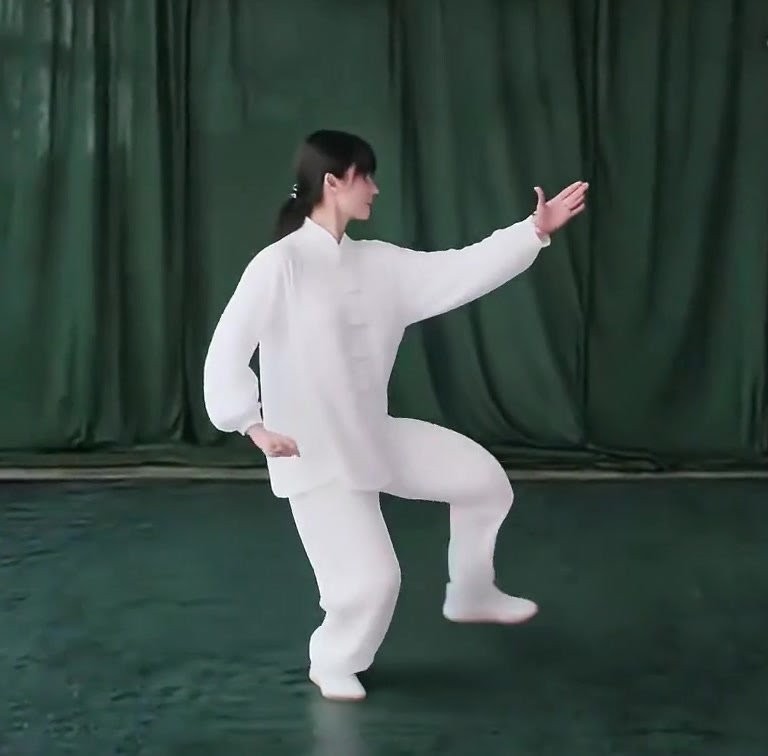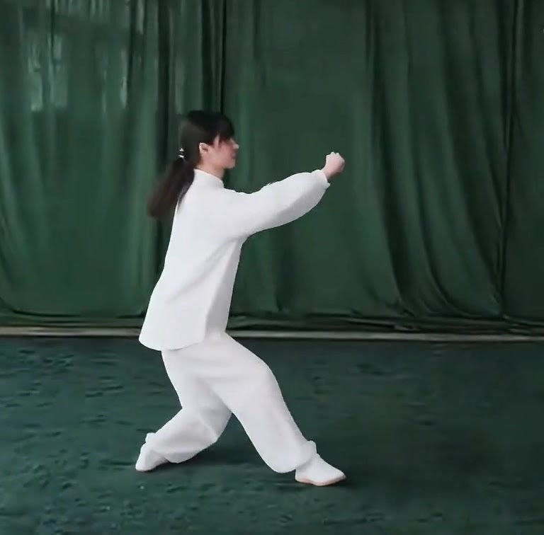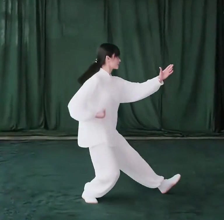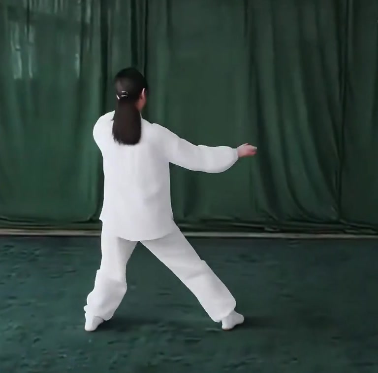 さらに体を右に回転させ、(うしろむきになる)、右足をいったん引いて (足先は外側にひらく) 足底の前丘部を地につける。同時に右手は左肩の前を通って前につきだし、拳心を上向きにする。左手をおろして、左膝のそばで下に押すような形になる。
