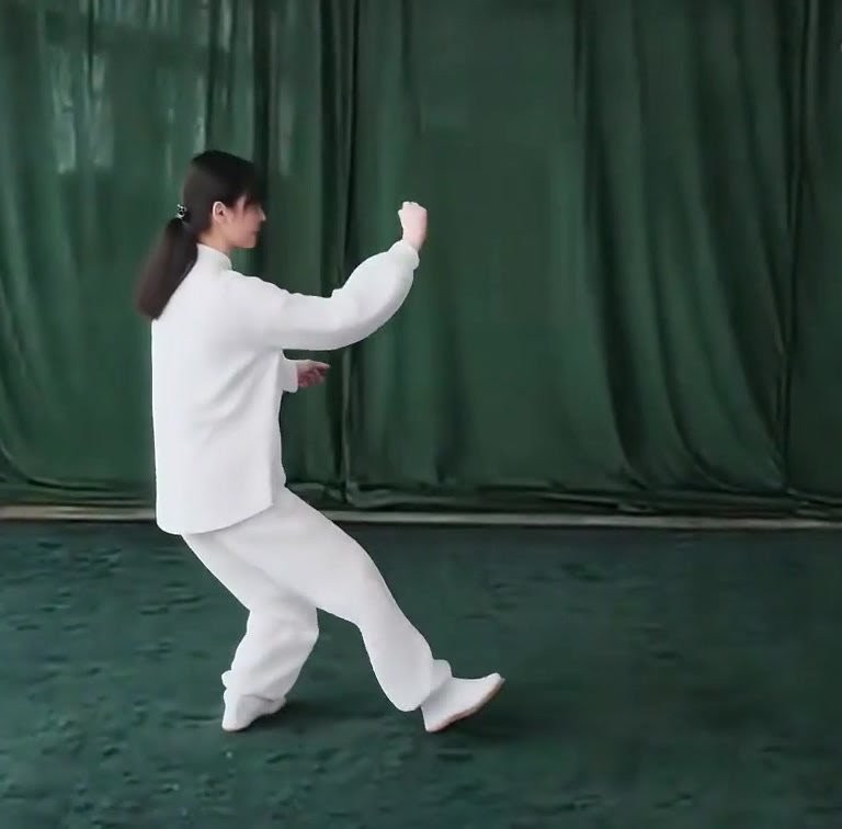 体をさらに右に回転させ、左の爪先をおろして重心をふたたび左脚に移す。右手を弧をえがいて下におろしつつ、手のひらを握って拳をつくり、腹の前を経て左胸の前まで上げる。(拳心、つまり手のひらの方向は下向き) 左手は左額の上方にあげてきて、手のひらを斜め上に向ける。