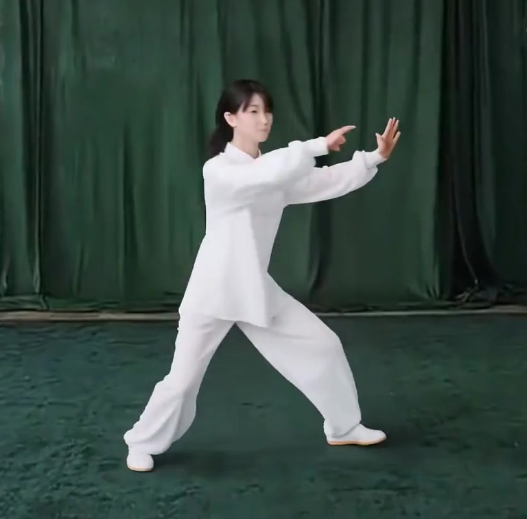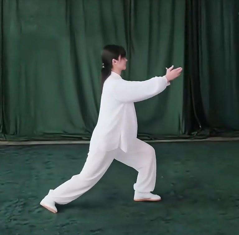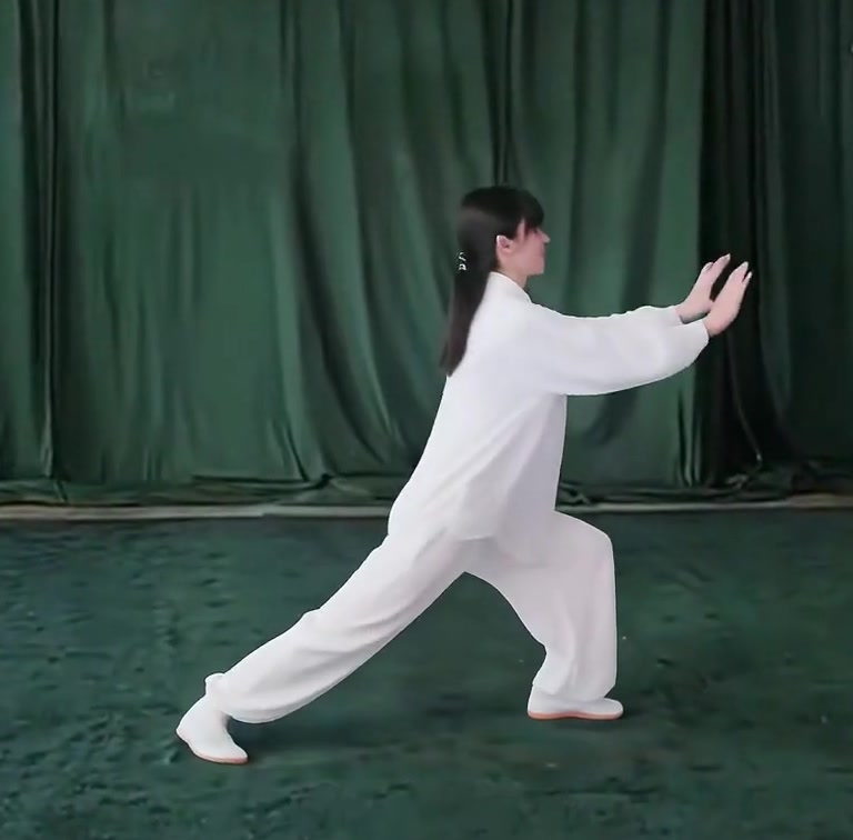 左足の爪先をおろして足底を地につけつつ、上体を前におしだして重心を左脚に移し、左弓歩をつくる。同時に、両手の手のひらを前に向けておしだす。そのさい腕は肩の高さまであげ、また両手の幅は肩幅と同じ。(手を押し出すときは、肩を沈めて、肘をたらし、腕に力を入れて、手のひらはちゃんとひらくて指をのばすこと)