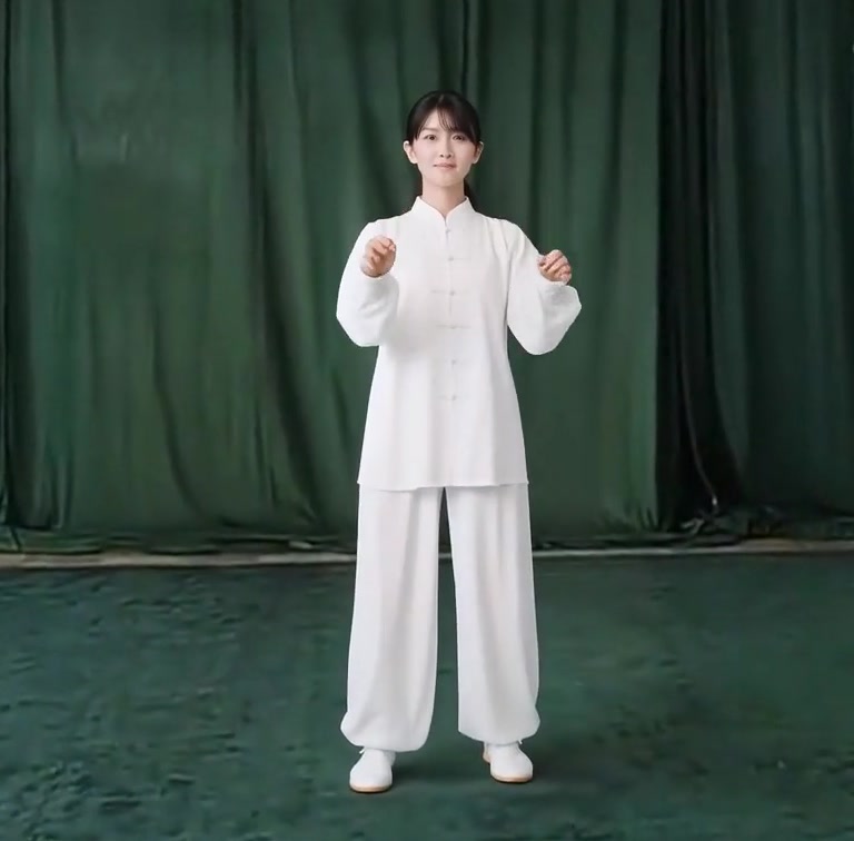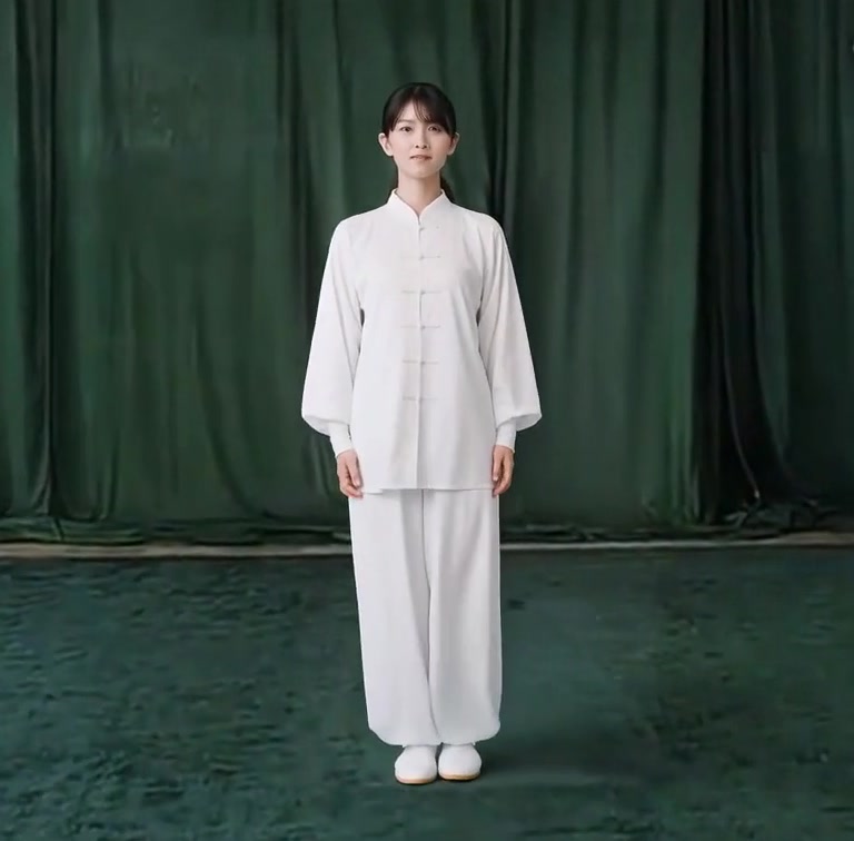 上体をかすかに左前に傾ける心持ちで右足を浮かし、半歩前によせ、足底の前丘部を地につける。ついで右足底を全部地につける。上体をひいて重心を右脚に移す。同時に上体をやや右に回転させて右手を下から回して右耳のそばまでひきあげる。(手のひらは左側に向き、指先は斜め下に向く) 左手は体の前面で下におろす。(手のひらは下に向き、指先は斜め前に向く)