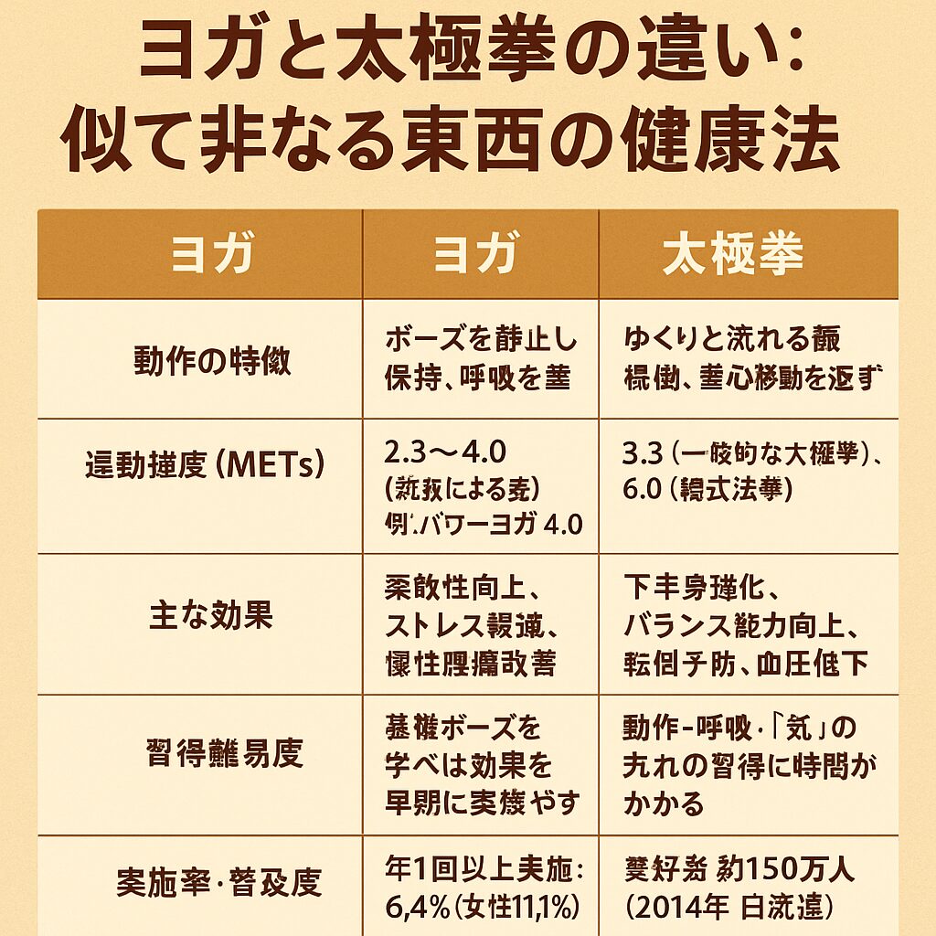 ヨガと太極拳の違い:似て非なる東西の健康法 ヨガと太極拳はいずれも「心と体の調和」を目指す健康法ですが、その成り立ちやアプローチは大きく異なります。本記事では、動作の特徴、運動強度、習得のしやすさ、健康効果の科学的根拠を比較し、併用のメリ... -